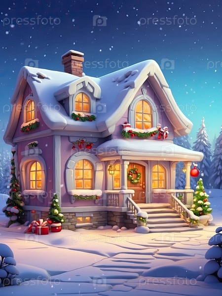 Мультфильм Уютный деревянный дом в горах ночью с рождественскими елками и подарками зимой на снегу и снегопаде с Рождественским декором - праздничная открытка