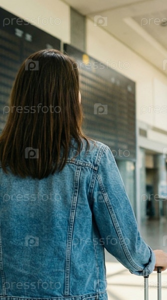 Женщина с коричневыми волосами в джинсовом куртке, идущая по терминалу аэропорта, ожидание поездки, начинается путешествие, отпускное настроение, сольное приключение