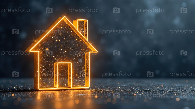 Прозрачное золото светящийся символ дома на сером бетонном фоне с золотым блеском. недвижимость, риэлтор, ипотека, страхование, бронирование, строительство, изоляция, отопление. ИИ генерируется