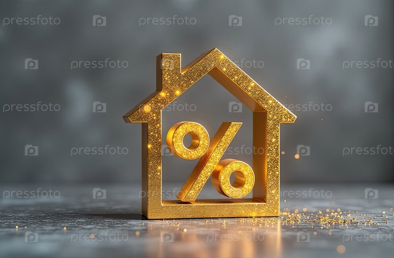 Золотой светящийся символ процент в доме на сером бетонном фоне с золотым блеском. строительство жилья, скидка, купон, покупка, продажа, риэлторская деятельность, ипотека, страхование, бронирование. AI generated