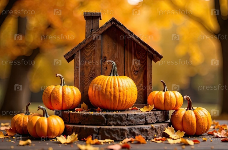 Крошечный эко-дом с тыквами и желтыми кленовыми листьями на осеннем фоне. недвижимость, дача, летний дом, ипотека, страхование, бронирование, строительство, изоляция. ИИ генерируется