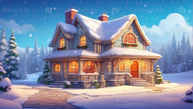 Мультфильм Уютный деревянный дом в горах ночью с рождественскими елками и подарками зимой на снегу и снегопаде с Рождественским декором - праздничная открытка