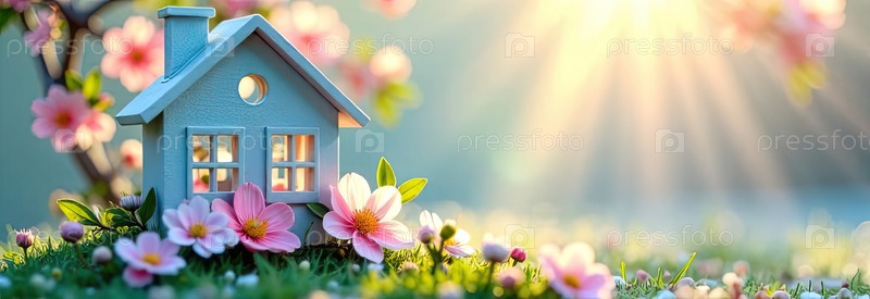 Крошечный дом в солнечных лучах, украшен весенними пастельными цветами на весеннем пастельно-синем фоне. недвижимость, риэлтор, ипотека, страхование, бронирование, строительство, изоляция. ИИ генерируется