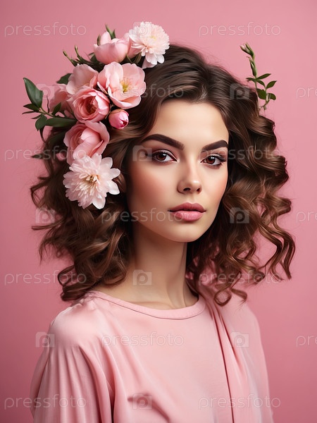Брюнетка с объемными коричневыми волосами и пастельной цветочной короной, розовый фон, весенняя красота, женственность, романтика, нежность, 8 марта, женский день