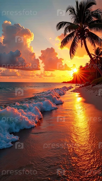 Красный закат на райском океаническом побережье с тропическими пальмами и волнами серфинга. Баннер для турагентства, горящий тур, туристический отдых в отеле. ИИ генерируется