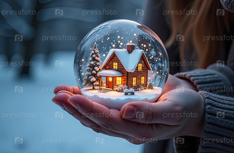 Магический стеклянный шар с крошечным современным домом и снегом внутри в уютной руке с рождественской елкой с гирляндами на фоне. страхование, ипотека, покупка недвижимости. ИИ генерируется