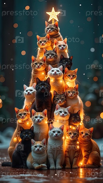 Рождественская елка из кошек, сделанная на праздничном снежном фоне с блеском, многоцветные сотни кошек складываются в форме высокой рождественской елки с золотыми светящимися гирляндными огнями