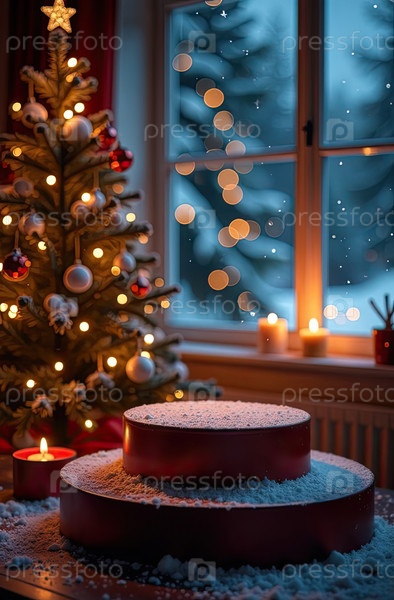 Пустая подиумная площадка для демонстрации продукта, дисплейный монтаж с рождественским декором, возле окна с елкой, снегом, свечами. Копирование пространства, Рождество и Новый год. ИИ генерируется