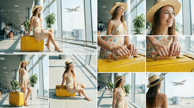 Коллаж женщины в летнем платье с чемоданом, путешествующей и ждущей в терминале аэропорта, туристическое приключение, городское путешествие, ожидание поездки