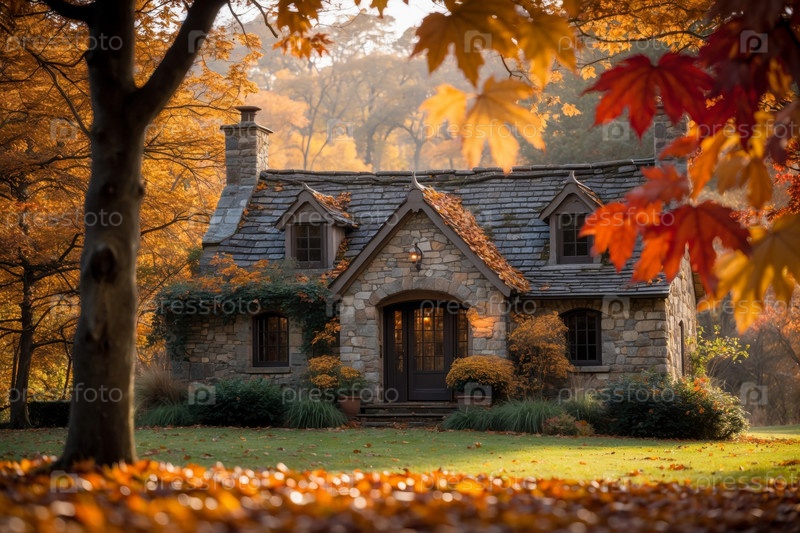 Дом здания ландшафтный фон красные и желтые листья осень-осень осенний лесной парк AI Generative
