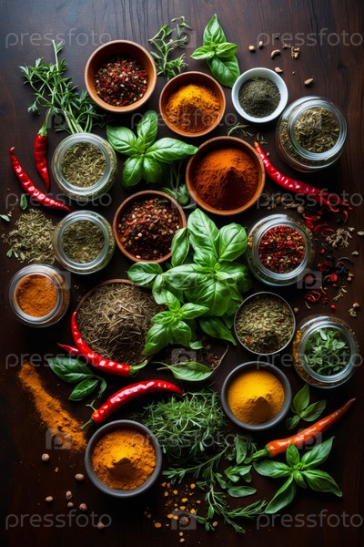 Различные многие ароматические вкусы сухие специи порошковые кучи ассортимент в стеклянных банках миски AI Generative