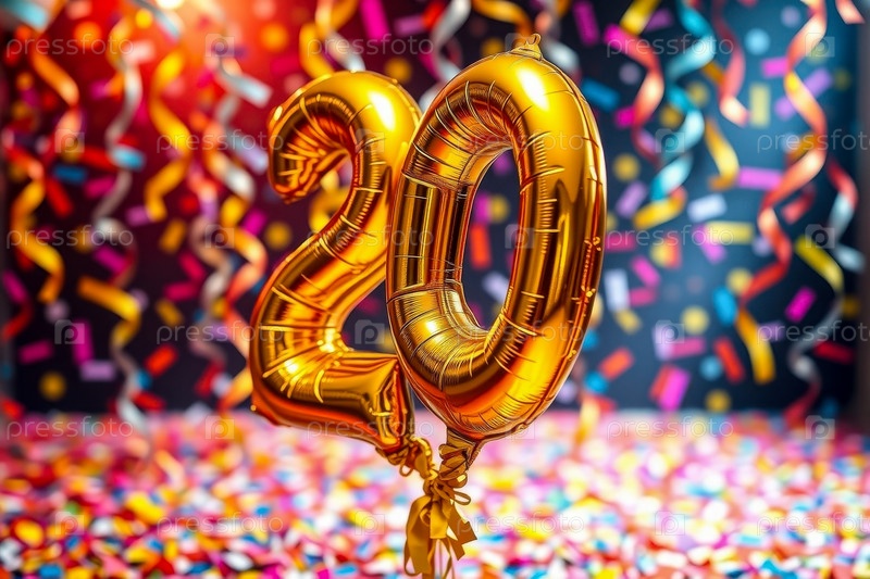 Гелиевый баллон на день рождения в форме числа двадцать, фигура золотой буквы 20 на фоне праздничного торжества