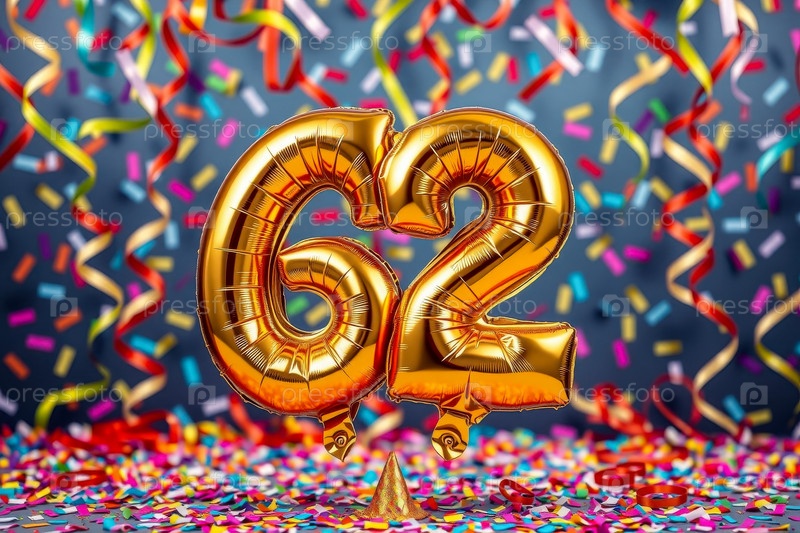 Гелий день рождения воздушный шар номер шестьдесят два, золотые буквы фигура 62 праздник праздничный фон