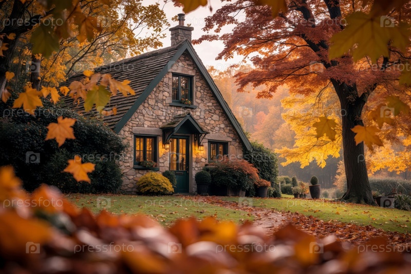 Дом здания ландшафтный фон красные и желтые листья осень-осень осенний лесной парк AI Generative