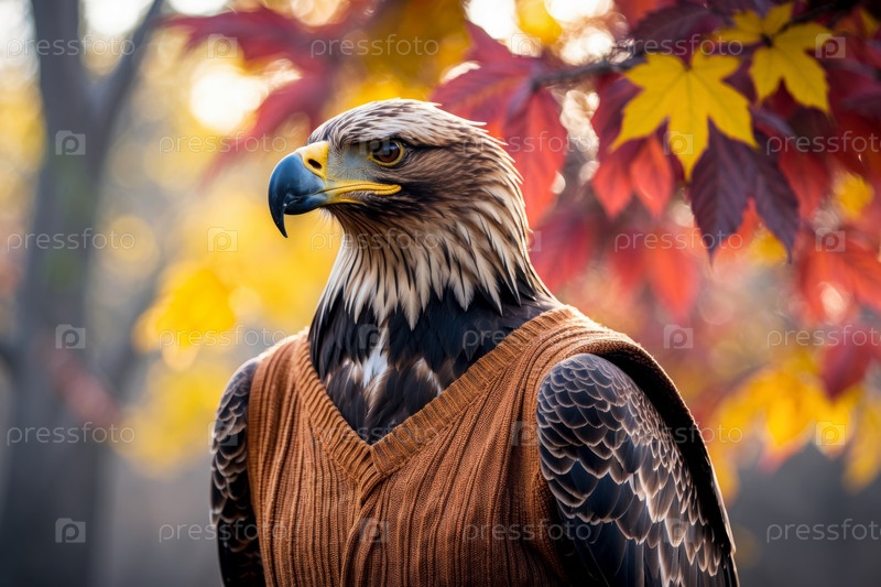 Generative Falcon в трикотажном свитере на осеннем лесном фоне, животное в красно-желтом листе AI