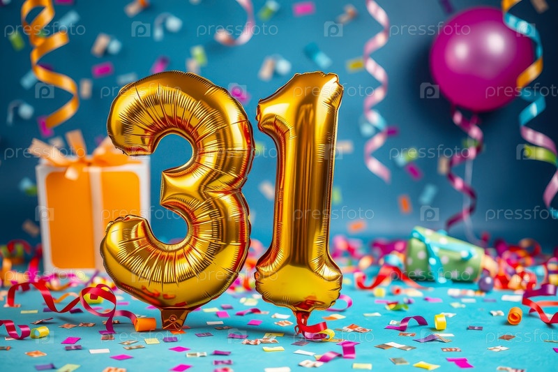 Гелий день рождения воздушный шар формы номер тридцать один, золотые буквы фигура 31 праздник праздничный фон декор