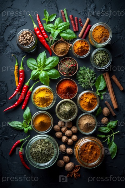 Различные многие ароматические вкусы сухие специи порошковые кучи ассортимент в стеклянных банках миски AI Generative