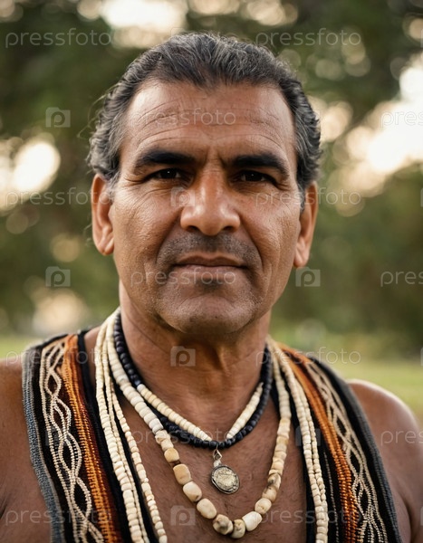 Достоинственный австралийский абориген уверенно стоит, демонстрируя сложные ожерелья и культурную гордость.Теплый вечерний свет подчеркивает его черты лица на естественном фоне