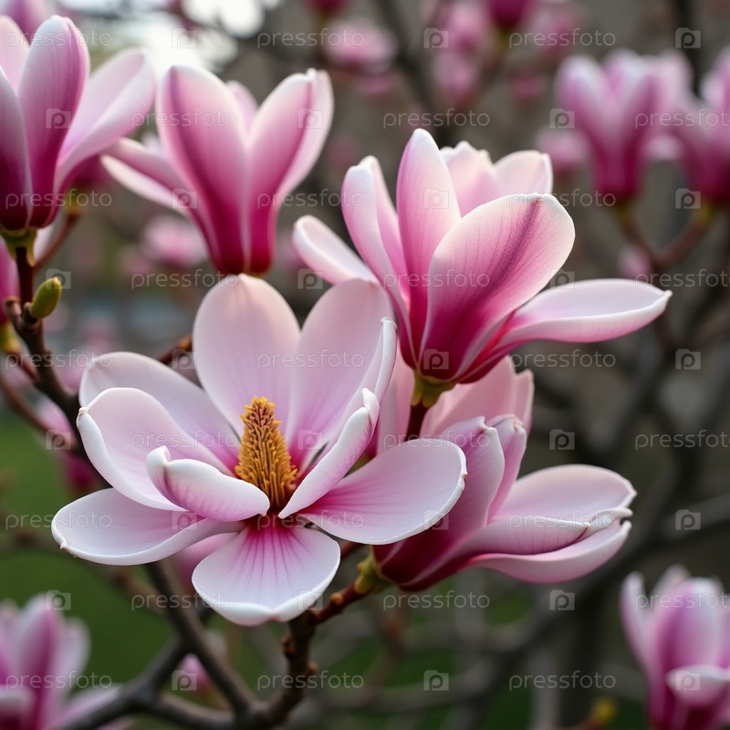Цветы магнолии в полном цветении демонстрируют потрясающие розовые и белые лепестки на фоне пышной зелени