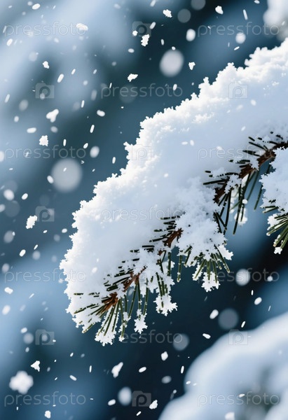 Снег покрывает ветви сосны, а вокруг нее мягко падают хлопья.Сцена запечатлела тишину зимнего дня в лесу Generative AI