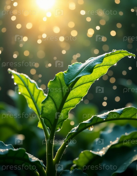 Великолепный солнечный свет фильтрует листву, освещая яркие зеленые листья, украшенные мерцающими капельками, вызывая спокойствие и обновление в мирном саду