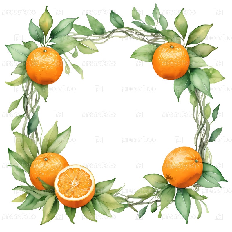 Яркое акварельное произведение искусства имеет апельсины и пышные зеленые листья в круговой планировке, идеально подходит для персонализированных приглашений или декоративных плакатов
