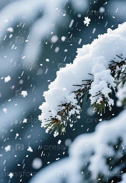 Снег покрывает ветви сосны, когда вокруг нее падают снежинки.На заднем плане видны размытые деревья в лесу.Контакт яркий и холодный Generative AI