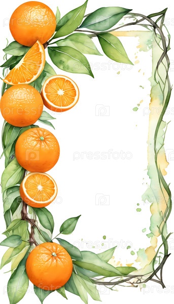 Наслаждайтесь красиво выполненной акварельной планировкой с яркими апельсинами и пышными зелеными листьями, предназначенными для заполнения любого пустого пространства свежей энергией и веселием