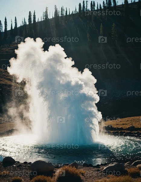 Потрясающий гейзер вспыхивает с земли, посылая шлейф воды и пара высоко в воздух