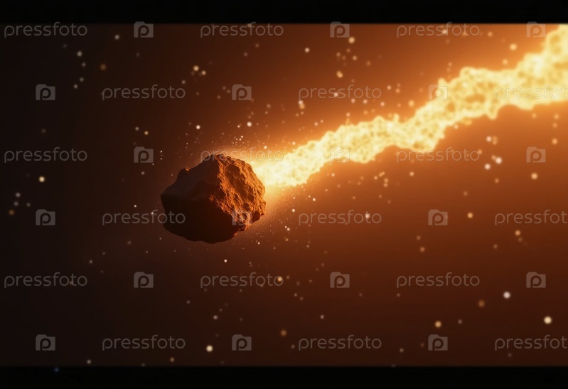 Вибрирующий астероид пробегает сквозь темные просторы космоса, оставляя за собой огненный след света, захватывающий космический пейзаж позади
