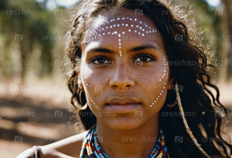 Молодая австралийская аборигенка уверенно стоит, ее лицо украшено сложными белыми отметками, символизирующими ее наследие