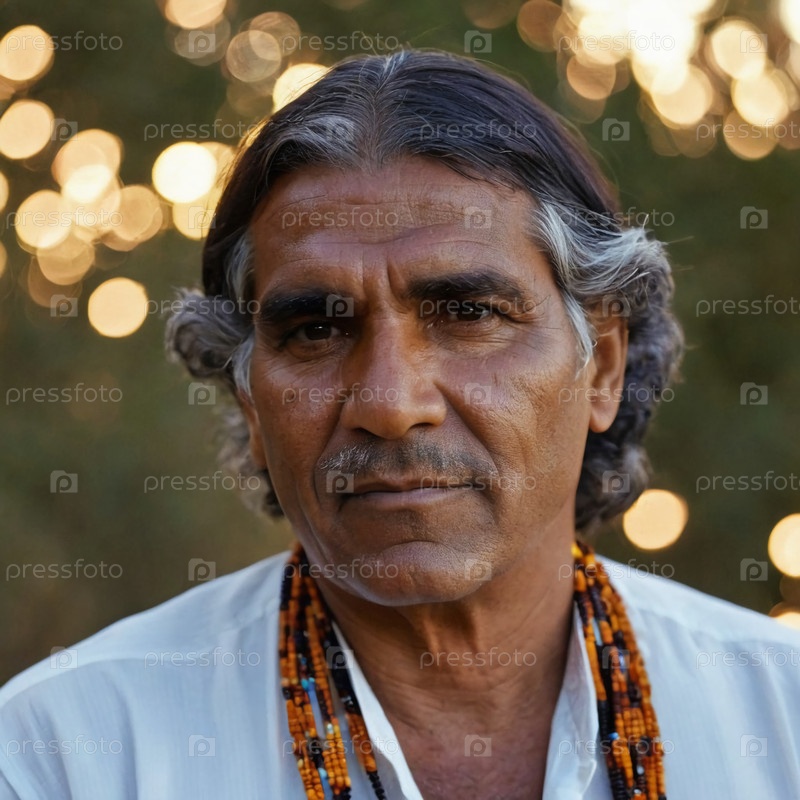 Гордый абориген уверенно стоит в традиционных ювелирных украшениях, золотое свечение сумерек подчеркивает его черты лица и отмечает свою культурную идентичность и связь с землей