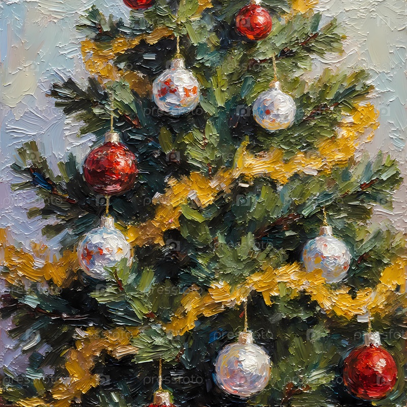 Рождественская елка украшена красными и серебряными шарами, висящими с ветвей.Желтая гирлянда обернулась вокруг дерева, создавая праздничный вид на каникулы Generative AI