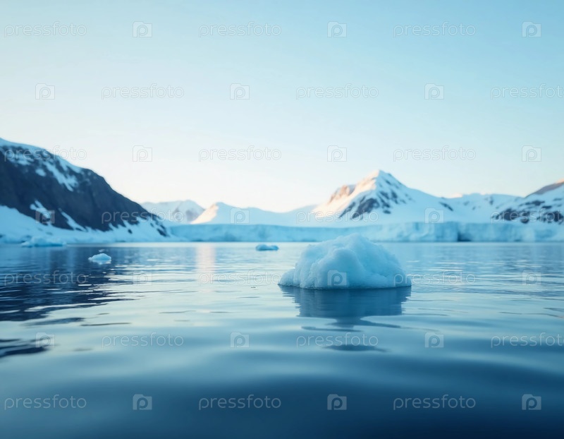 При восходе солнца возникает тихий арктический ландшафт, который бьёт мягкий свет на ледяные воды.Ледники плавают нежно в окружении величественных гор и чистого синего неба Generative AI