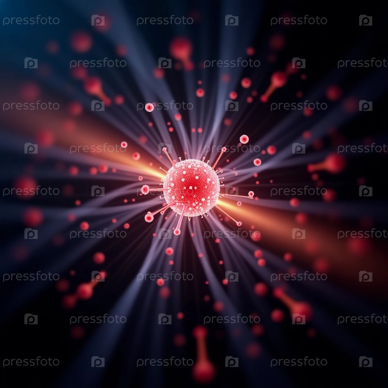 Ярко-красные частицы излучаются наружу в завораживающем танце на темном фоне, иллюстрируя сложный мир молекулярных взаимодействий и энергетической динамики