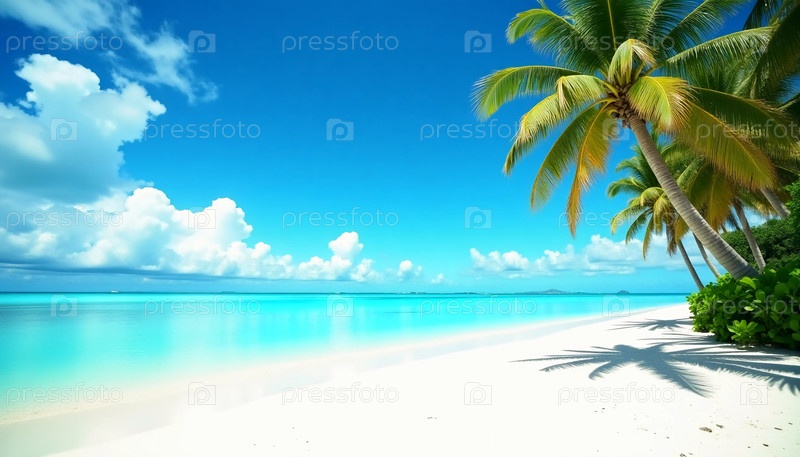 Мягкий белый песок простирается вдоль берега, поцелованный нежными бирюзовыми волнами. пышные пальмы обеспечивают тень, когда пушистые облака лениво дрейфуют через яркое голубое небо