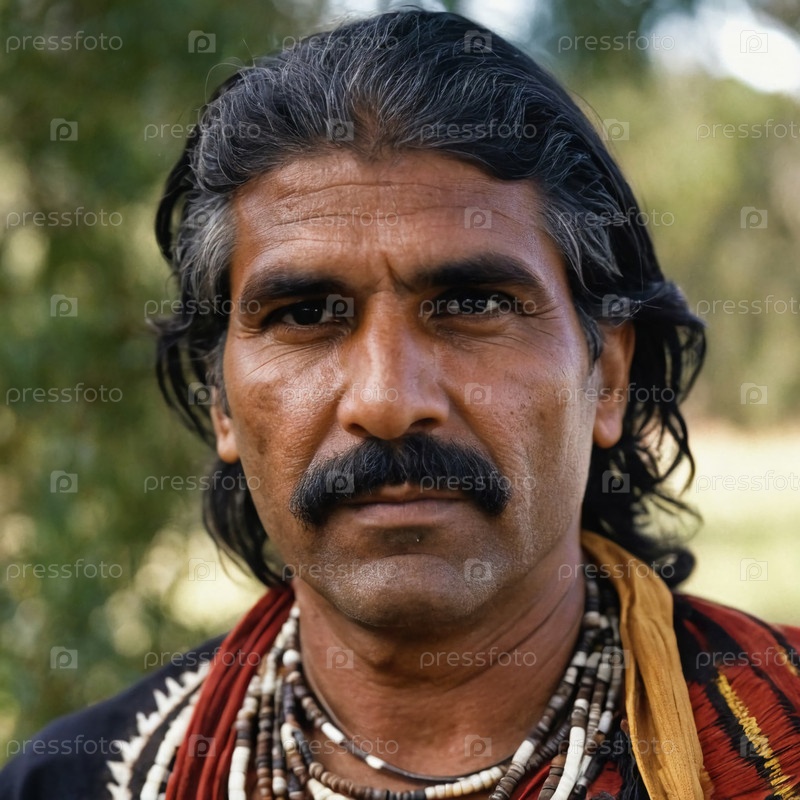 Абориген средних лет стоит с серьезным выражением лица, украшенный культурными драгоценностями и одеждой.Он окружен пышным пейзажем, отражающим его наследие