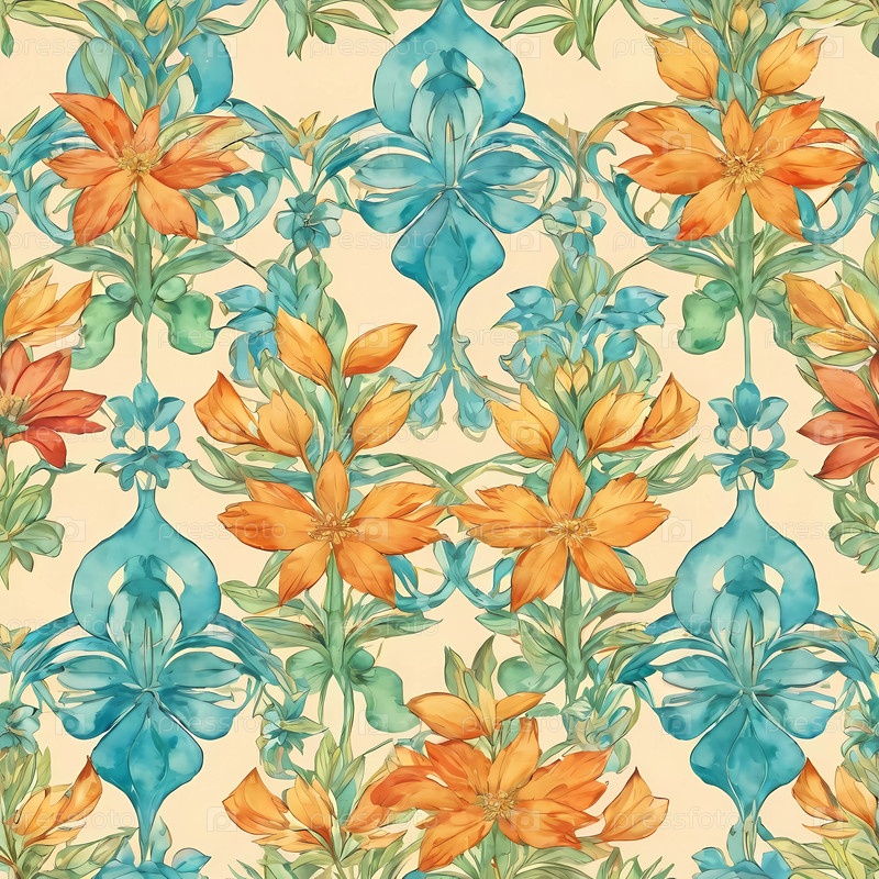 Ярко окрашенные цвета в оранжевый и синий отражают сложный рисунок на мягком фоне, идеально подходит для дизайна тканей, обоев или художественных проектов, которые отмечают красоту природы Generative AI