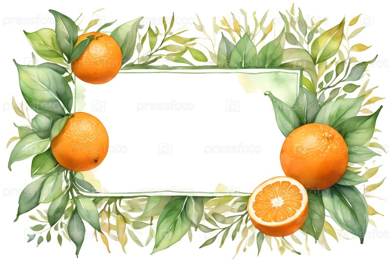 Творческое акварельное искусство с яркими апельсинами в окружении пышных зеленых листьев для привлекательного дизайна макетов Генеративный ИИ