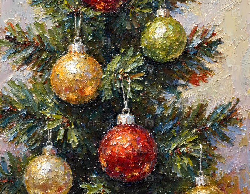 Декоративные шары висят на рождественской елке, сделанной из масляной краски.Дерево имеет зеленые ветви и разноцветные орнаменты, которые показывают радость праздничного сезона и новогодних торжеств Generative AI