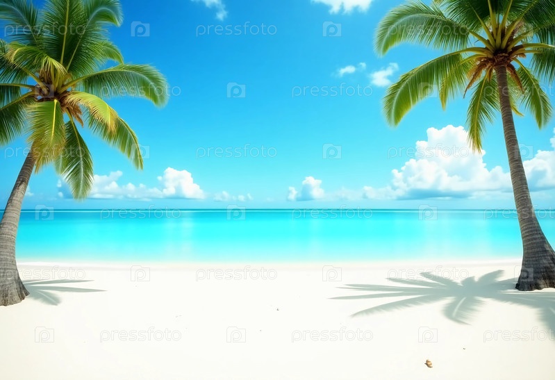 Мягкий белый песок простирается вдоль тихого пляжа, где пальмы обеспечивают тень.Нежные волны обходят берег под чистым голубым небом, создавая спокойную атмосферу Generative AI