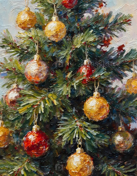 Рождественская елка, украшенная блестящими шарами в красных и золотых цветах.Дерево заполнено пышными зелеными ветвями, создавая праздничную атмосферу для сезона каникул Generative AI