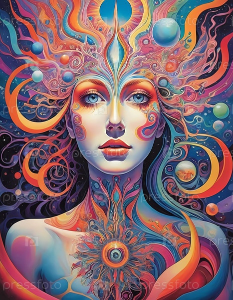 Завораживающее сочетание цветов изображает женскую фигуру с распускающимися волосами, окруженную космическими элементами. Психоделические красочные видения и галлюцинации. Малые элементы. Генеративный ИИ