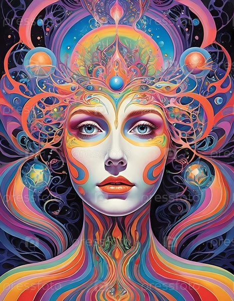 Завораживающее сочетание цветов изображает женскую фигуру с распускающимися волосами, окруженную космическими элементами. Психоделические красочные видения и галлюцинации. Малые элементы. Генеративный ИИ