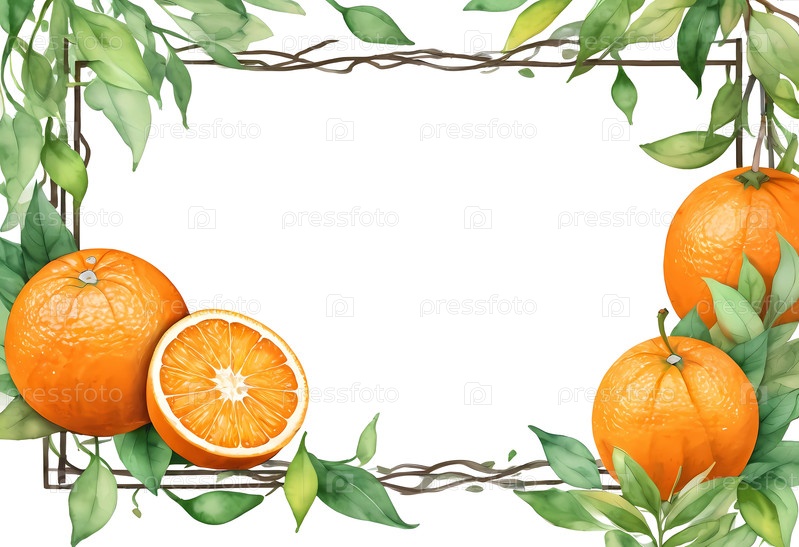 Потрясающий акварельный макет с ярко-оранжевыми плодами, окруженными пышными зелеными листьями, идеально подходит для приглашений или персонализированных приветствий в художественном стиле