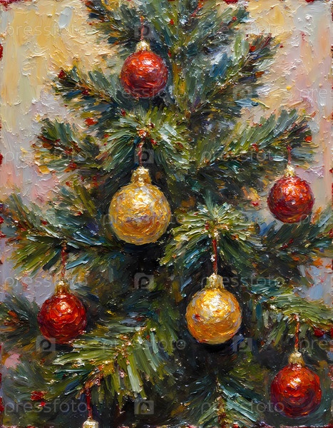 Красочные шары рождественской елки висят на зеленой ели в этой масляной живописи, отмечая праздничный сезон Рождества и новогодних торжеств с радостью Generative AI
