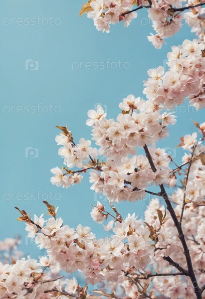 Цветы вишни мягко раскачиваются в ветре, демонстрируя свои нежные розовые оттенки на ярко-синем небе.Искусство природы приносит радость и тепло весеннему дню Generative AI