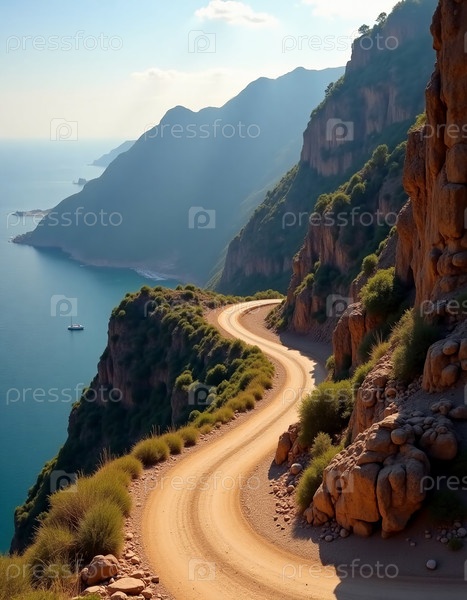 Вдоль скал извилистая грунтовая тропа открывает захватывающий вид на блестящее море. пышная зелень венчает каменистые образования, создавая идиллическое убежище для исследователей природы Generative AI