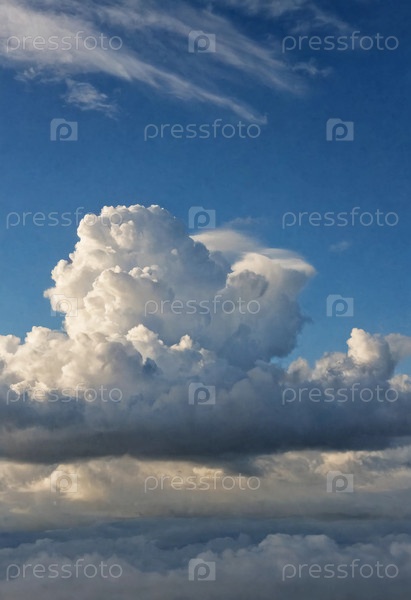 Пушистые белые облака бушуют на ярко-синем небе, освещенном полуденным солнцем.Тени играют над нижними облаками, создавая глубину и удивление в обширной просторе