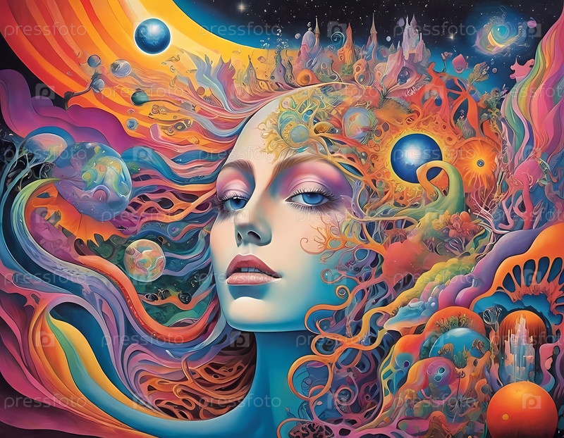 Завораживающее сочетание цветов изображает женскую фигуру с распускающимися волосами, окруженную космическими элементами. Психоделические красочные видения и галлюцинации. Малые элементы. Генеративный ИИ